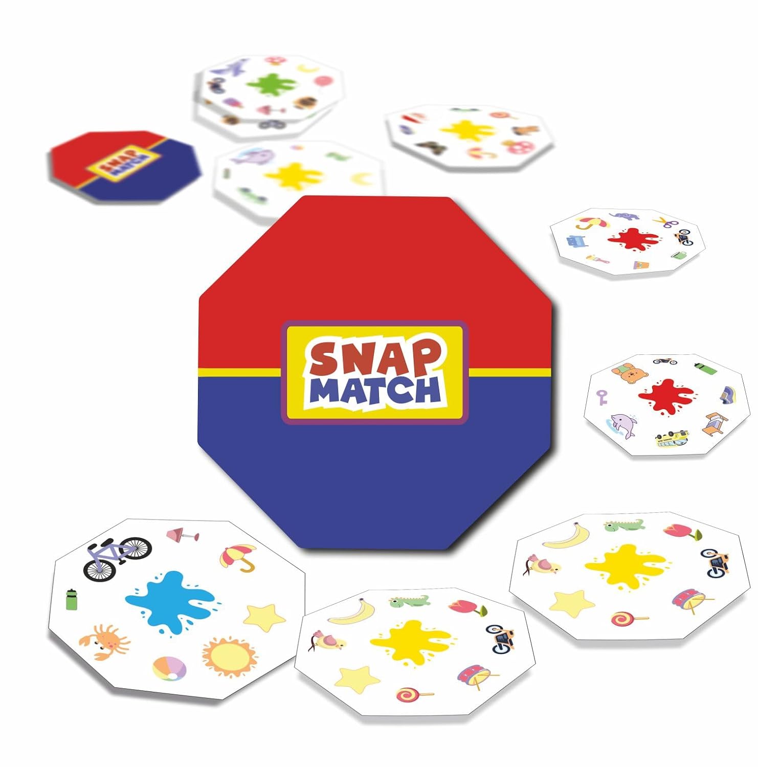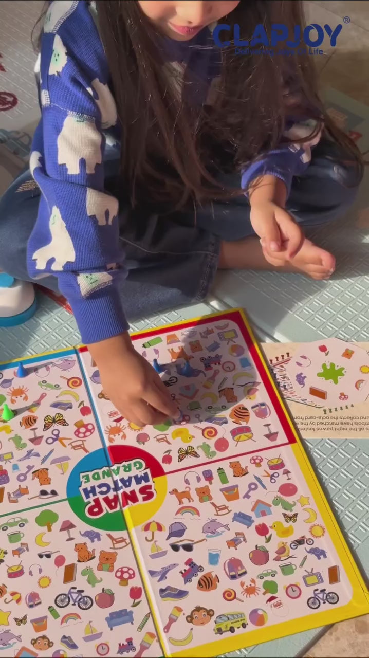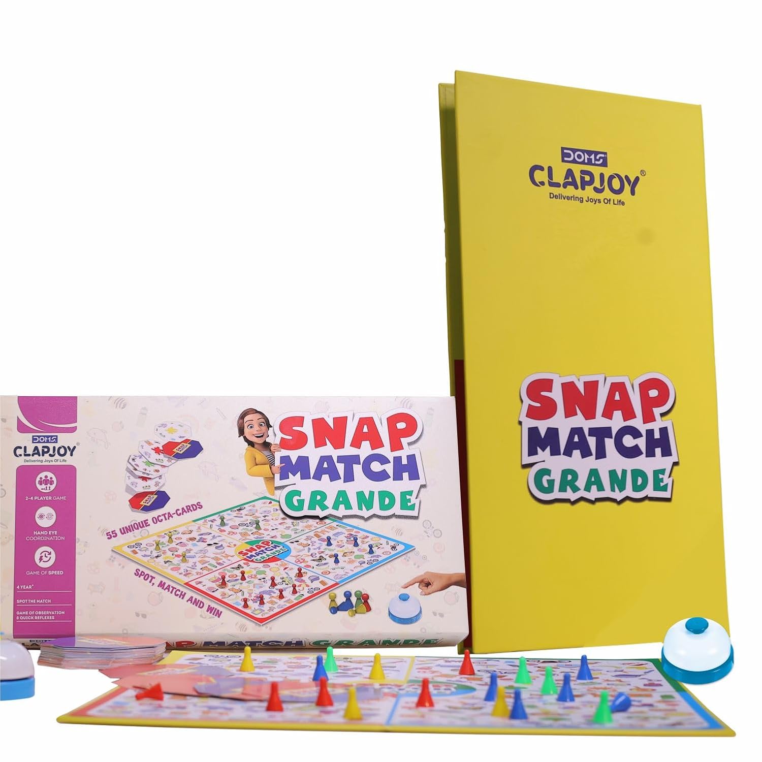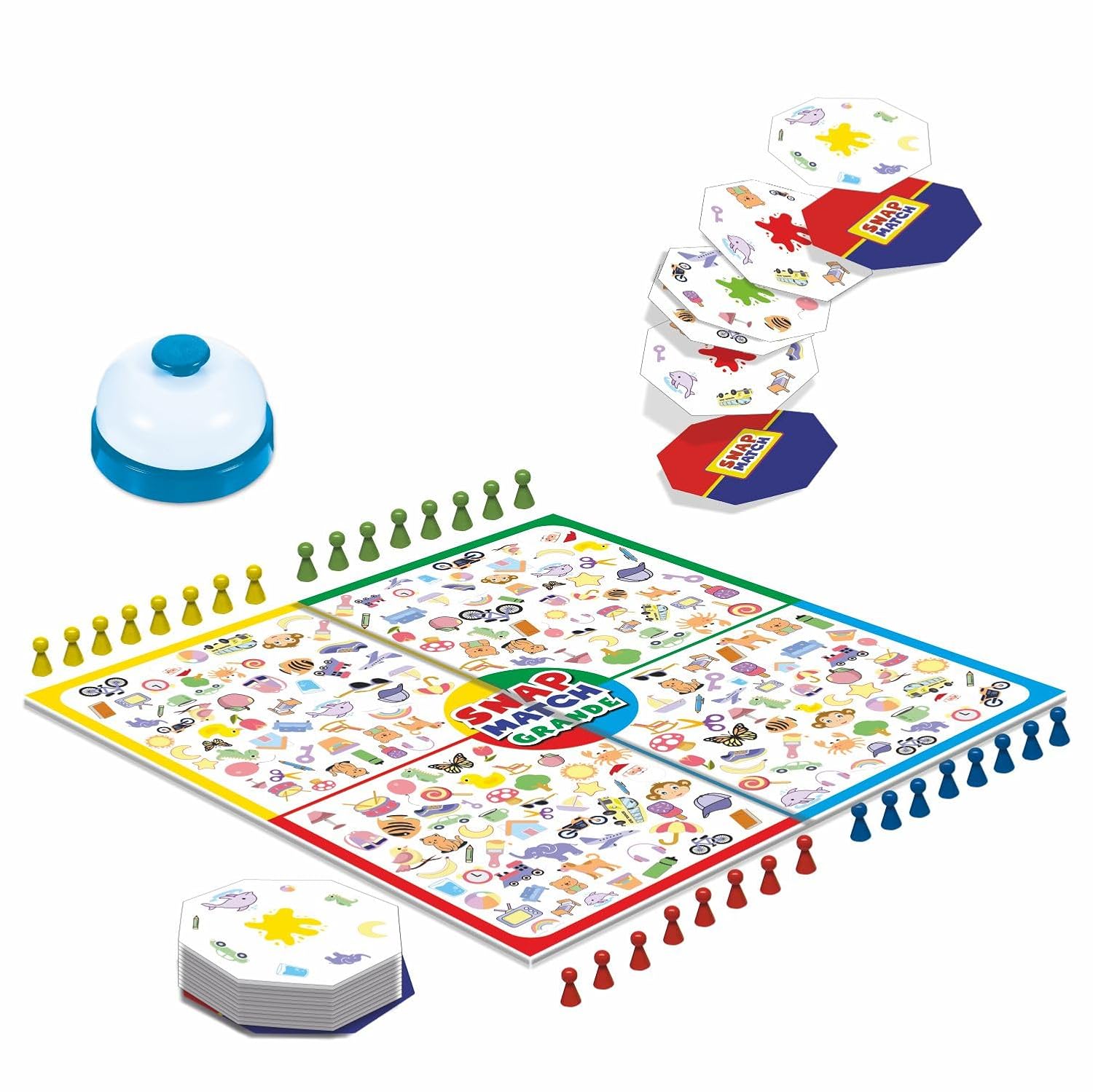 Snap Match Grand takes the excitement of classic matching games to the next level! This action-packed game includes 1 sturdy board, a fun-to-ring bell, 32 colorful pawns, and 55 pattern-rich cards.