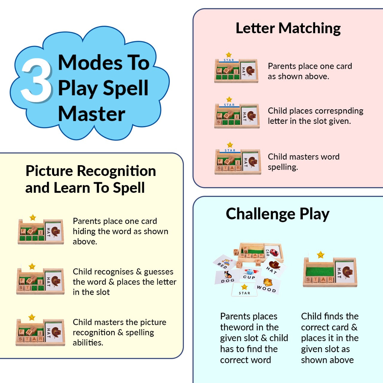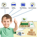 - Includes: 1 wooden tray, 8 letter cubes, 25 picture cards (50 words), and 25 double-sided flashcards featuring 50 everyday words like animals, food, and weather.